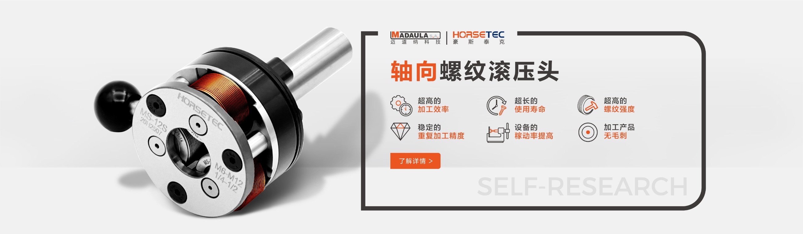 豪斯泰克HORSETEC · 花鍵花紋滾壓頭 有:軸向花紋滾壓頭、徑向花紋滾壓頭、滾花刀等。 -- 滾壓頭替代了單刃刀具加工螺紋效率低、成本高的問題,在一次裝夾一個(gè)工序上加工完成,可以減少95%的螺紋加工時(shí)間,降低生產(chǎn)成本。 -- 延伸系數(shù)達(dá)到5%的材料都可以進(jìn)行滾壓加工。 -- 如果在有芯軸支撐的狀況下,薄壁空心零件也可以進(jìn)行滾壓加工。 -- 可用于大多數(shù)類型的機(jī)床:數(shù)控機(jī)床、鉆床、單軸車床、多軸機(jī)床、轉(zhuǎn)盤式機(jī)床、CNC車床、加工中心、走心機(jī)、專機(jī)及縱切機(jī)床等。